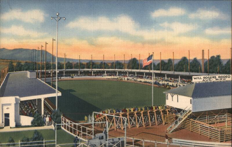 Front: of WILL ROGERS RODEO AUG 32 92 Back: 2151-SPENCER PENROSE STADIUM AND COLORADO SPRINGS RODEO, AT BROADMOOR, PIKES PEAK REGION, COLORADO 945 " SANBORN SOUVENIR CO., DENVER, COLO. "C. T. ART-COLORTONE, 9A-H1142