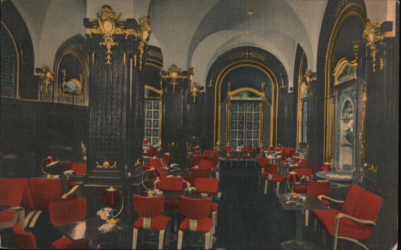 Interior view of the exquisite new Ebony Room, featuring black walls, black rugs, rich George Innes, Jr. original paintings, black featuring gold relief wall-panels. Gold relief -- A gay dash of scarlet furniture. Lighting from a colorful fountain and column cameos making for a cocktail atmosphere of pleasant intimacy. |