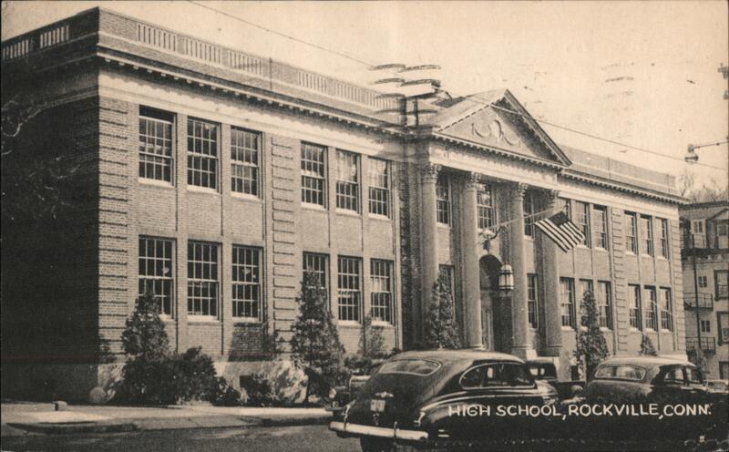 Black and white image of the High School in Rockville, Connecticut. There are three cars in front of the school. The handwritten message on the back of the card says 'Dear Marion: I was so sorry I missed seeing you when I was in Plainfield very glad to know you are married and have a pleasant home. I would like to hear from you if you would care to write to me. I always thought she thought much of you said to me she was so very fond of you.' |