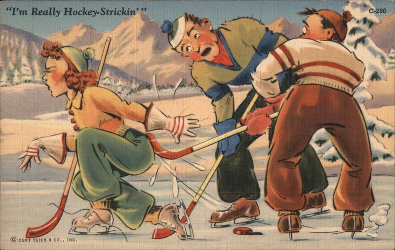 | A humorous cartoon postcard featuring three children playing hockey on an iced-over lake or pond. One child dressed in yellow and green has fallen on the ice in front of two boys who are surprised. The boy in the blue sweater says, "I'm Really Hockey-Strickin'." |
