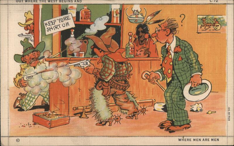 Comic illustration of a saloon in the west. There is a gunfight between a cowboy and a man in chaps, there is a Native American man at the bar ducking for cover and a dude in a green suit looking very concerned. Inset image in the upper right of two cowboys racing horses. |