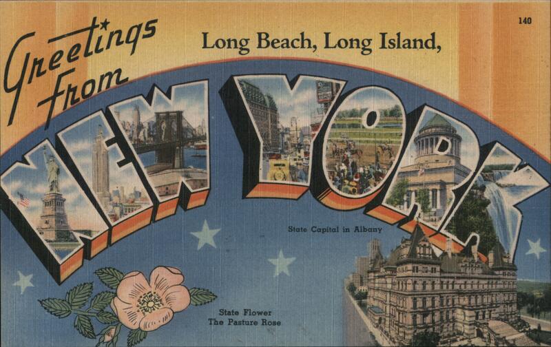 Front: neelings Long Beach, Long Island, 140 State Flower The Pasture Rose State Capital in Albany Back: PUB. BY FRANK E. COOPER. 258 BROADWAY. NEW YORK 7, N. Y. 72851 FEC. NEW YORK M_