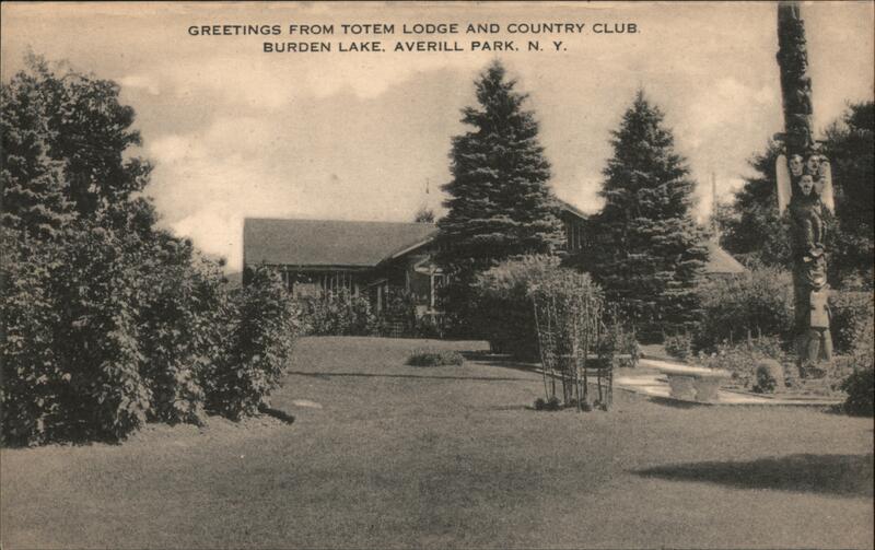 Front: GREETINGS FROM TOTEM LODGE AND COUNTRY CLUB. BURDEN LAKE, AVERILL PARK, N. Y. Back: ARTVUE POST CARD CO., 225 FIFTH AVE., NEW YORK, N. Y. ARTVUE