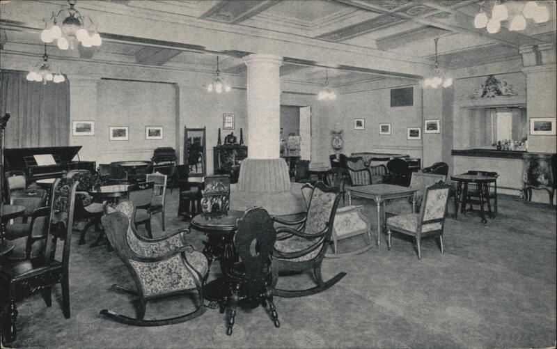 Interior view of the Gay Nineties Lounge at the Hotel Henry with period furniture, including a piano, tables and chairs. The back of the card describes the lounge, noting its 1890s furnishings, and that it also contains a "mauve decade" setting. Rates for rooms at the Hotel Henry start at $2.50. |