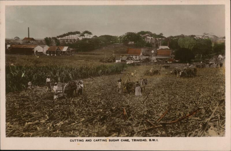 Front: CUTTING AND CARTING SUGAR CANE, TRINIDAD, B.W.I. Back: Published by Canning & Co. Ltd., Trinidad, B.W.I. written here