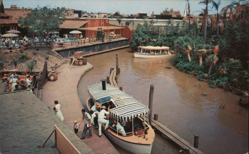 | All ashore from a trip down the "Rivers of the World" as the tropical steamers stop to land passengers at the Adventureland port in Disneyland. The river banks abound with plants native to the tropics and life-like "animals" lurk in the river waters. |
