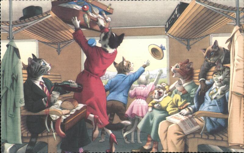 Anthropomorphic cats travel by train. One cat stows luggage, another waves goodbye, while others look out the window or read. A cat in a suit enjoys a drink and bread.