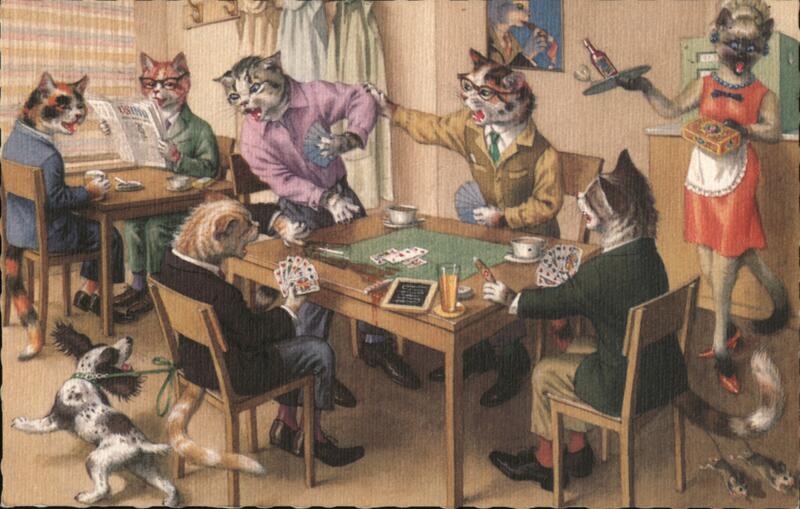 Anthropomorphic cats playing cards, drinking, and causing a ruckus in a cafe. A dog is running through the scene, pulling on its leash. A waitress cat observes.