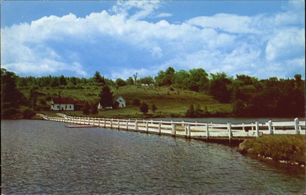 The famous floating bridge over Sunset Lake at Brookfield, in the Green Mountains, Vermont. The only one of its kind in daily use.