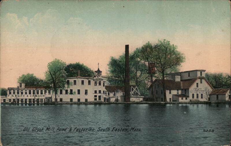 | An image of the Old Grist Mill, Pond & Factories in South Easton, MA. Handwritten message: "Having a grand time. Going to Plymouth next Sunday. Going to Duxbury next Sunday. Came in last night. Going to the beach every day. Wish you were here." |