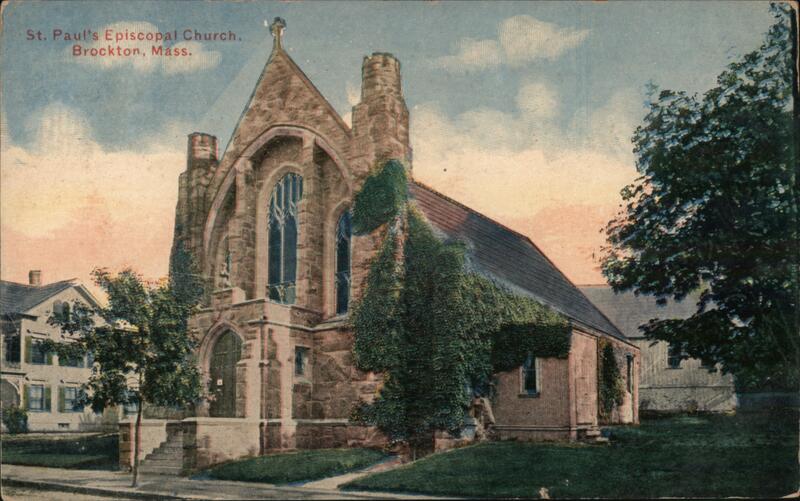 An image of St. Paul's Episcopal Church in Brockton, Massachusetts. The handwritten message on the back states, "Dear Papa, I am getting along fine. I rec'd the box and everything is O.K. Hope you are all well. I am going to stay here until next Thursday. With lots of love to all, from, Grace." |