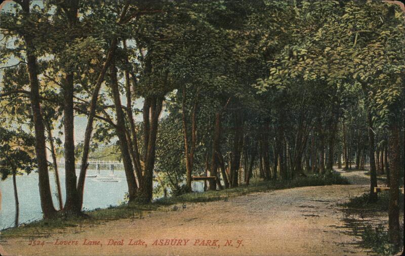 A view of Lovers Lane along Deal Lake in Asbury Park, New Jersey. A sailboat can be seen on the lake. There are several benches along the lane. The handwritten message on the back states, "Sent Sunday Call last night. All well, getting along nicely. L&R." |