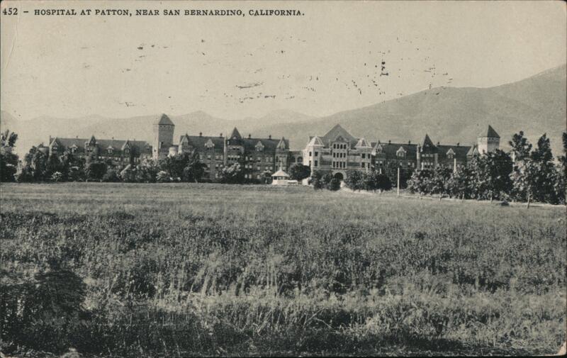 | A view of the Patton State Hospital, located near San Bernardino, California. The hospital buildings are situated amidst a field, with mountains visible in the background. The handwritten message on the back reads, "Dear Shulla! Hope you will send mother a birthday card on the 18 of May. We all expect to deluge her with postals. Fine weather, only two or three raindrops since you left. Write letter later. Lovingly, Papa." |