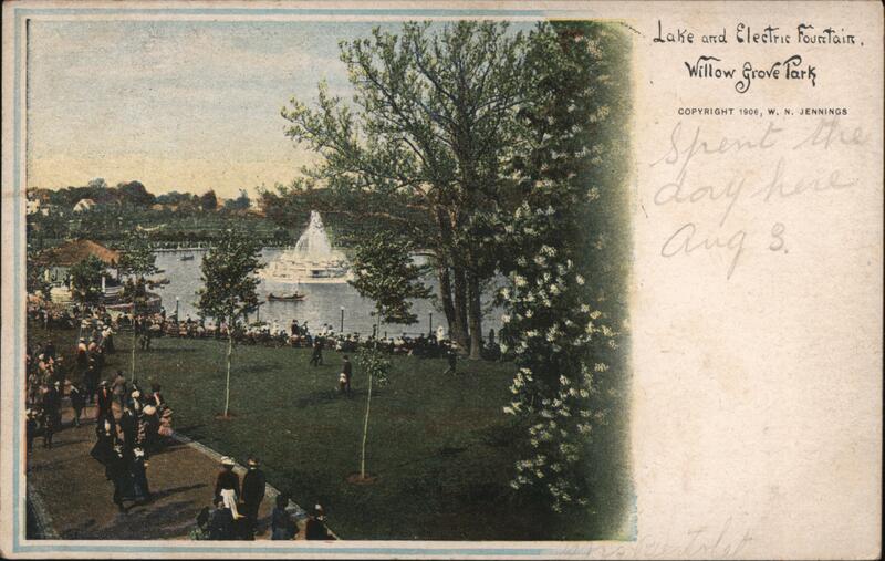 | A view of the lake and electric fountain at Willow Grove Park. People are enjoying the park, strolling along the paths, and sitting by the lake. A handwritten message on the back reads "Mrs. A. Mosteller Spring City Pa. Spent the day here Aug 3." |
