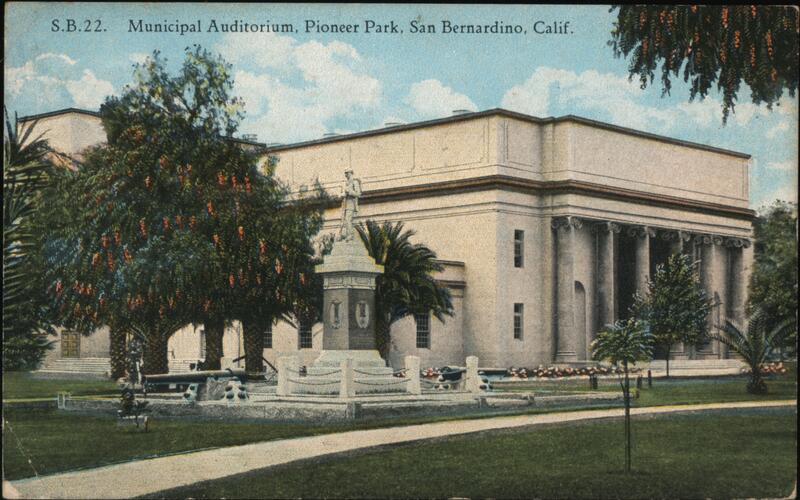 A view of the Pioneer Park Municipal Auditorium in San Bernardino, California. There is a monument and cannons in the foreground. Handwritten message on back: Aranyos Kelének már megint napok óta és így be voltam a mult héten egy nagy koncerten hatalmas volt. Sok ember volt akik kéréltek és mi csak azt. |
