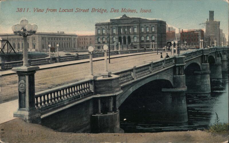 A view of the Locust Street Bridge in Des Moines, Iowa. The bridge spans a river, and buildings can be seen in the background. Handwritten message on back: Dearest Fanny, Just thought I would send you a card. Am getting along fine. Hope you are all well. With love, Grace. |