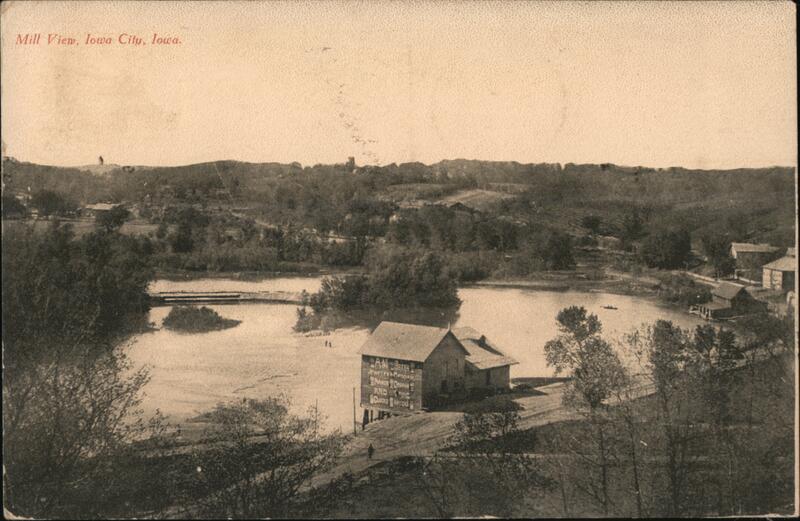 A view of Mill View in Iowa City, Iowa. There is a mill in the foreground, along with a river or creek. Across the river are buildings and trees. Handwritten message: "In the other sheet is my other and my present sheet is with the card. Have you took it away from you, so can they furnish the tag when not in use. A good hard year to you. From Mr. Dir." |