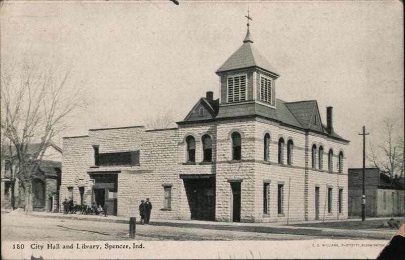 Front: 180 City Hall and Library, Spencer, Ind. C. U. WILLIAMS, PHOTCETTI, BLOOMINGTON Back: PHOTOREHE TC. U. WILLIAMS T BLOOMINGTON, ILLINOIS (PHOTORETE Fran 12/12/08 gro. Ithis where Miss Groigia Somaay مسال go creating. Reme Planfield 2nd