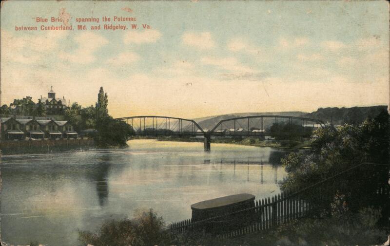 | View of the Blue Bridge spanning the Potomac between Cumberland, MD and Ridgeley, WV. The handwritten message on the back reads, "Dear Brother, How are you all? Hope you are all well. We are having nice weather. Wish you were all here. Will write you a letter soon. From H. Bro." |