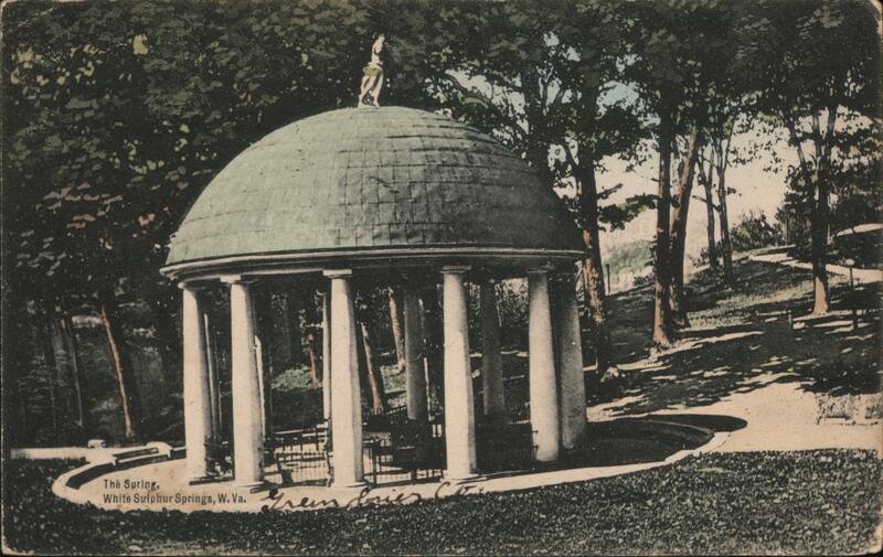 A view of The Spring, a domed gazebo-like structure supported by columns, located within White Sulphur Springs. Handwritten message: Dearest Mollie, Left my home Oct. 19. Took the last roses to the cemetery. Hope you are well. I feel awful since I came here. Having nice time, my eyes still give me trouble they may leave with me. Thanks heaps for a loving greeting from your friend Albert & Cecil. |