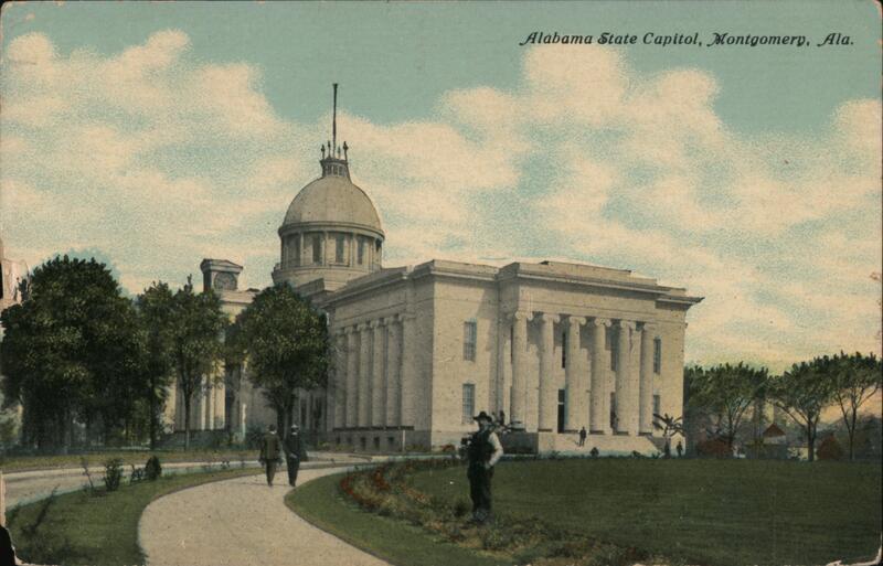 | A view of the Alabama State Capitol Building in Montgomery, Alabama. There are two men walking on a path in front of the building, and another man standing on the lawn. Handwritten message: "Arrived down to Montgomery alright. Going out to the fair this afternoon. This is a very pretty place. We are having a very good time. Everything is lovely and dandy. Lots of love. Will write again soon." |
