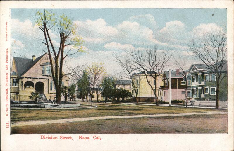 A view of Division Street in Napa, California, featuring houses and trees lining the roadway. The handwritten message on the back reads, "Dear Minnie, I got your card and was so much pleased to hear of you getting along so nicely. How are all the folks? We have a very surprising and pleasant winter so far. Austin." |
