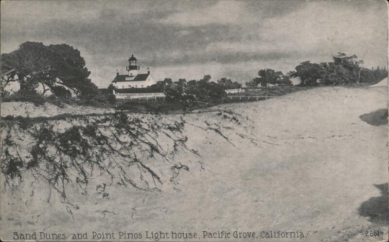 | View of sand dunes and the Point Pinos Lighthouse. Pacific Grove is advertised on the back of the card as a summer and winter resort with splendid fishing, boating, bathing, submarine gardens, glass bottom boats, 100 miles of incomparable scenic auto-mobile drives, primeval forest, and sea shore beaches. |