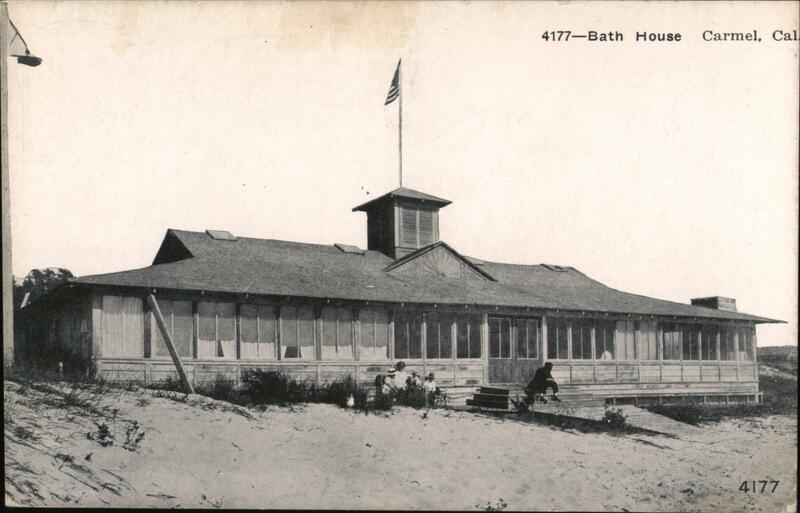 A view of the bath house at Carmel, California. Two people are sitting on the steps of the bath house. A flag is flying from the roof of the bathhouse.