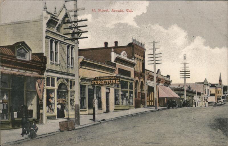A view of H Street in Arcata, California. There are several businesses along the street including H. R. Johnson & Co. Furniture. A woman stands in front of a store, and a child sits on the sidewalk near a crate. Handwritten message on back: