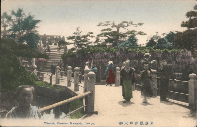 Front: Wisteria Blossom Kameido, Tokyo. 神天 井龜京東 Back: POSTKARTE. Carte postale Cartolina postale Postcard ОТКРЫТОЕ ПИСЬМО. きかは便