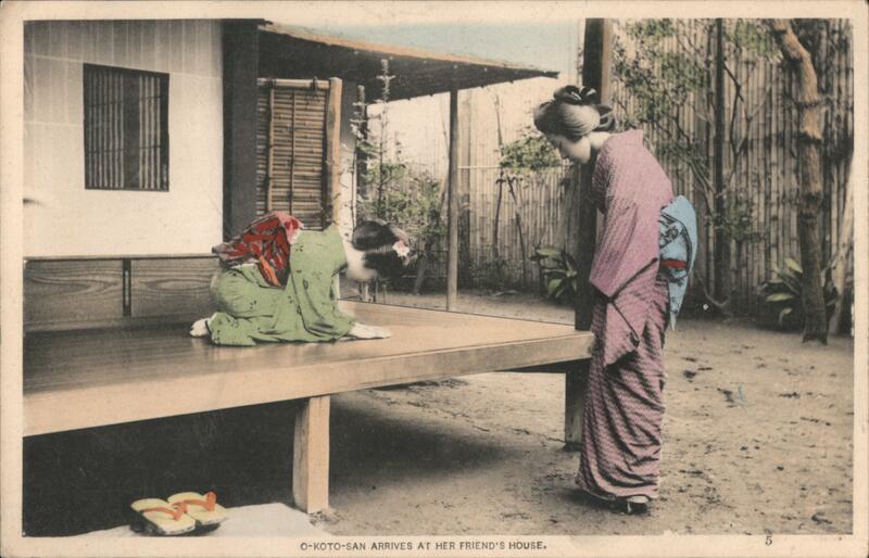A Japanese woman, O-Koto-San, arrives at her friend's house and bows deeply while her friend returns the greeting. Geta can be seen on the step.