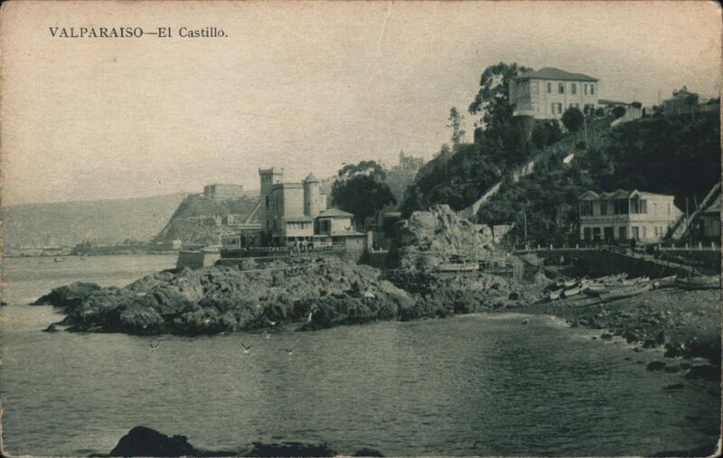 View of El Castillo and surrounding buildings from the rocky coast. The back is divided and says "Tarjeta Postal 200 Carte postale.--Union postale universelle, CHILE"