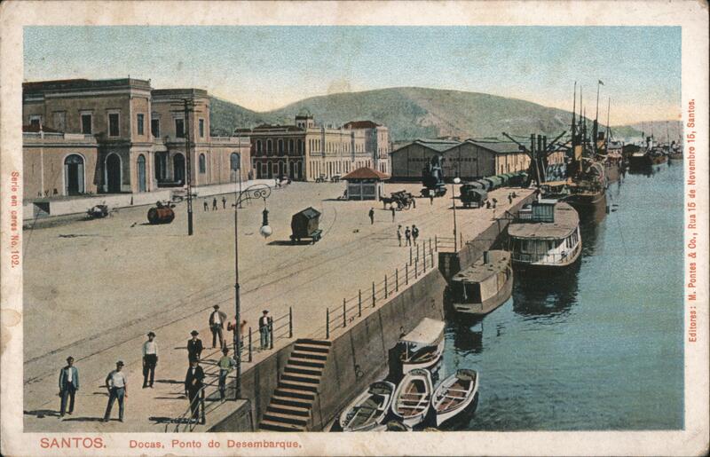 Front: Serie em cores No. 102. AT ก.ก SANTOS. Docas, Ponto do Desembarque. Editores: M. Pontes & Co., Rua 15 de Novembro 15, Santos. Back: CARTÃO POSTAL. UNION POSTALE UNIVERSELLE. Estados Unidos do Brazil. 250