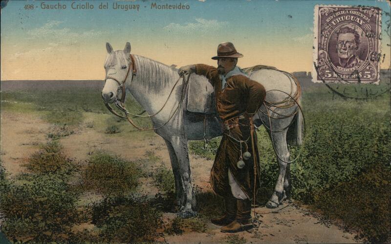 A Gaucho, or skilled horseman, stands next to his white horse in the Uruguayan countryside. He wears traditional attire, including a wide-brimmed hat, a poncho-like garment, and loose trousers tucked into his boots. He carries a lasso and bolas.