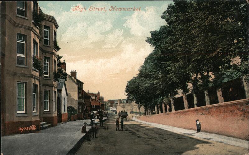 Children playing in the street. A brick wall and trees line the right side of the road.