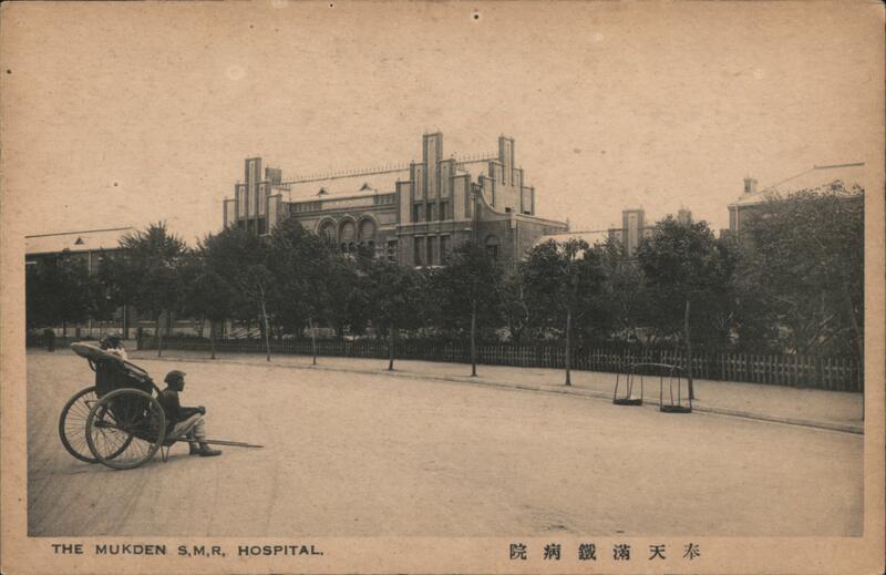 A rickshaw driver sits in his rickshaw in front of the South Manchurian Railway Hospital in Mukden, Manchuria.
