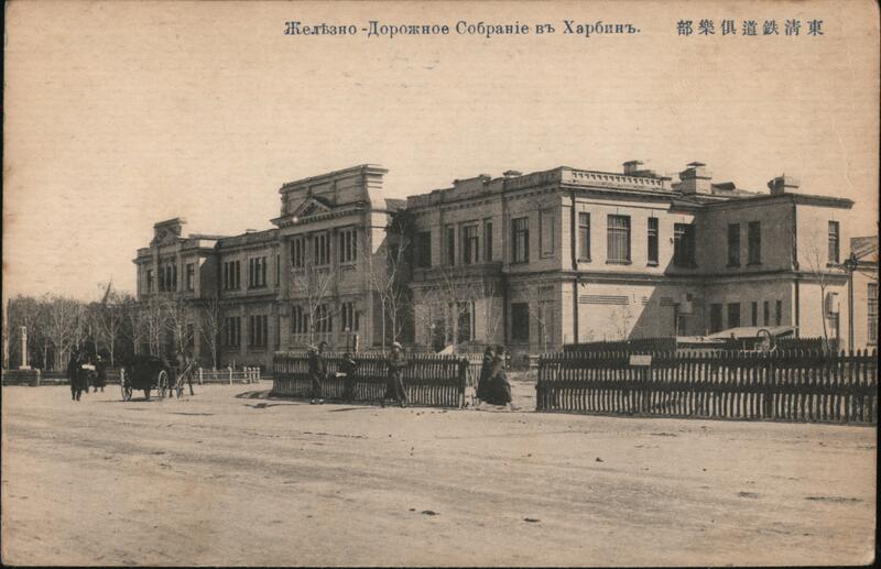 A view of the Railway Assembly building in Harbin. Several horse-drawn carriages are visible on the street in front of the building.
