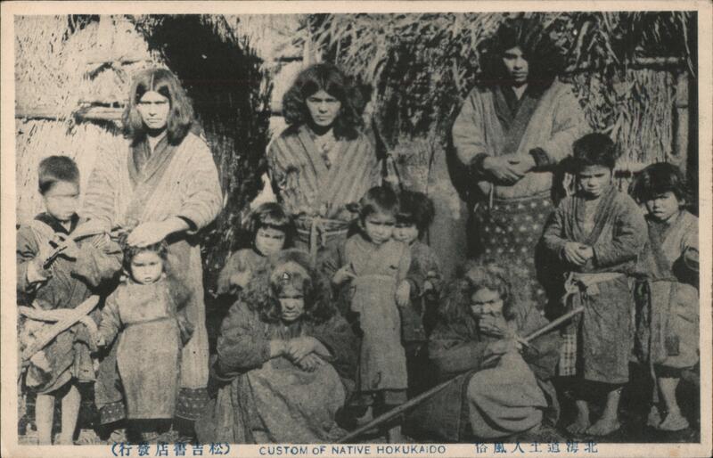 Group portrait of Ainu people, men, women and children, in traditional clothing, standing and sitting in front of a thatched structure.