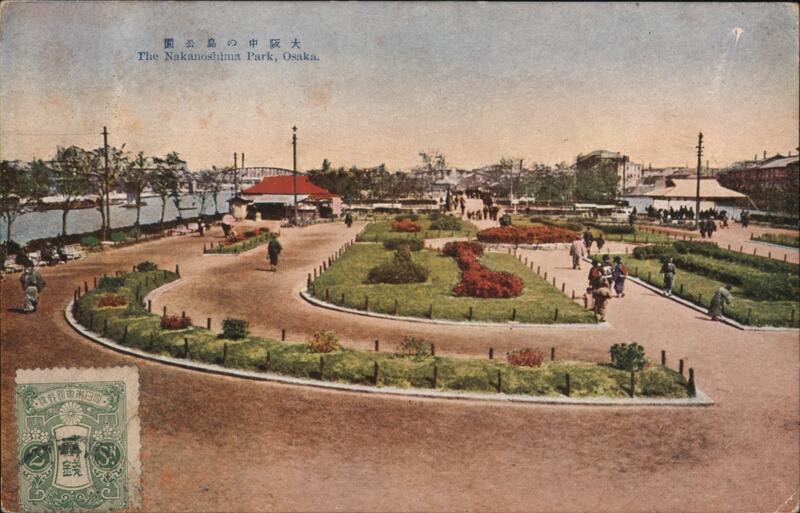 View of Nakanosima Park, Osaka with people strolling and a pavilion.
