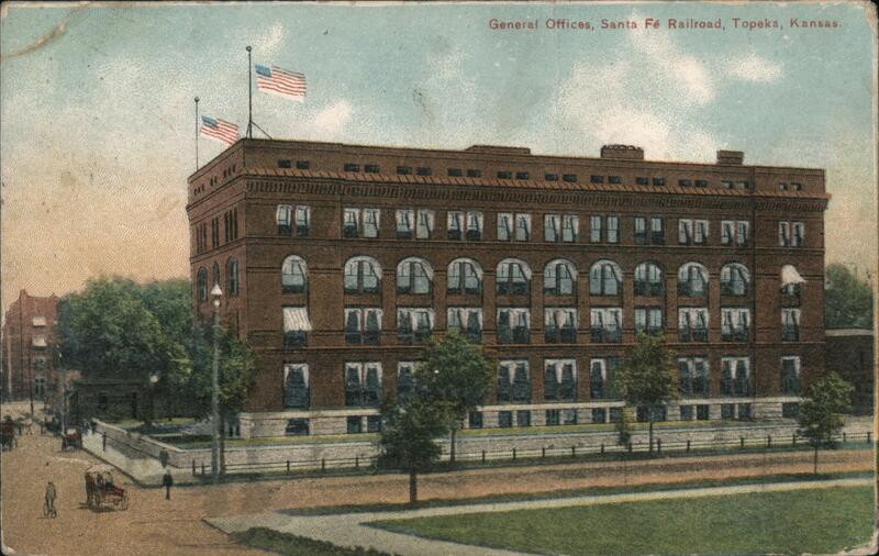 | A view of the Santa Fe Railroad General Offices in Topeka, Kansas. The multi-story brick building has arched windows and awnings. American flags fly from two flagpoles on the roof. Trees, sidewalks, and a grassy area are visible in front of the building. A horse-drawn carriage and pedestrians are on the street in front of the building. |
