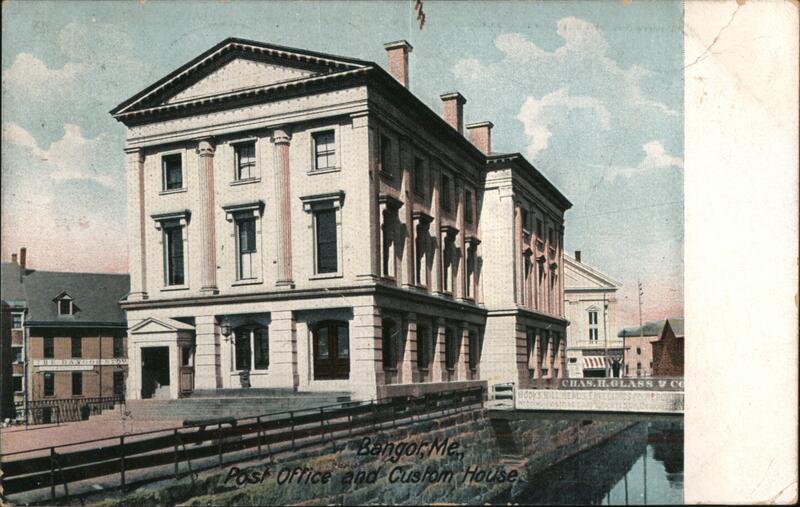 View of the Post Office and Custom House in Bangor, Maine. The building features prominent columns and pilasters. A canal runs in front of the building, with a bridge visible. Handwritten message: "Are now at Bangor, had a start of 1,30 have had lunch and still have 45 miles to drive all dry. Miss May K." |