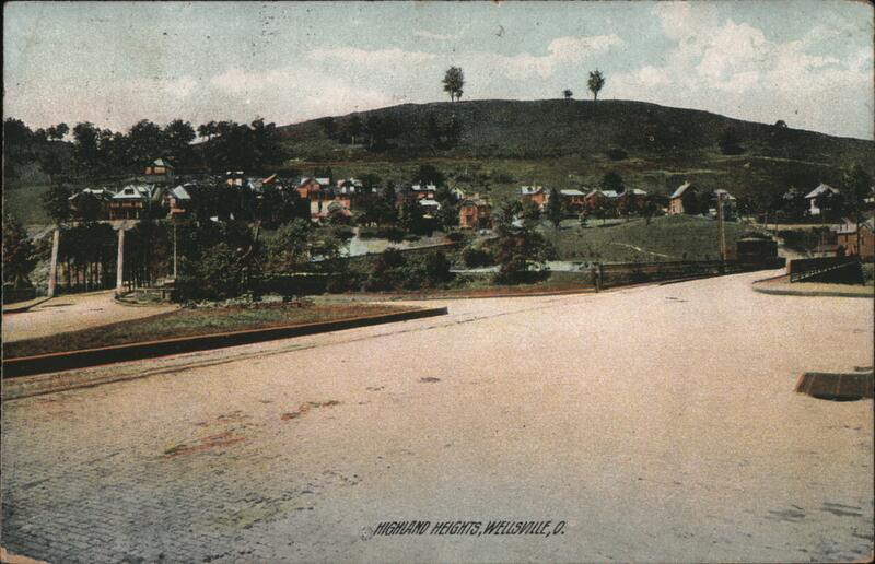 A view of Highland Heights in Wellsville, Ohio. Houses are visible on the hillside, and a pond or lake is in the foreground. A road and bridge are also visible. Handwritten message on back: "Horrid sprint we are having and waiting from + reading the other + waiting from you. Still the horrid sprint. Get to the bottom yet. Glad to hear from you." |