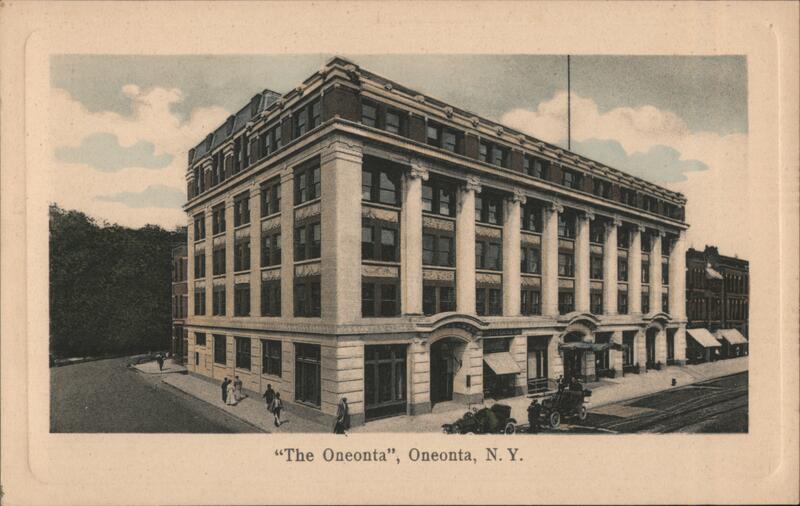 A view of the Oneonta Hotel in Oneonta, New York. There are people and automobiles on the street in front of the building.