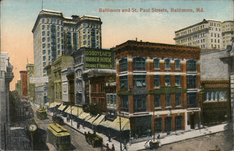 Front: Baltimore and St. Paul Streets, Baltimore, Md. 1111 GOODYEAR'S RUBBER HOUSE GEORGE P. THOMAS J S HATS III Back: Pub. by J. Thos. Smith, Baltimore, Md. 181 COMMUNICATION Two Cents.