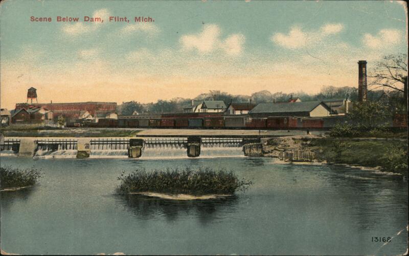 Front: Scene Below Dam, Flint, Mich. 13168 Back: PUBLISHED BY SOUVENIR POST CARD COMPANY. PRINTED IN NEW YORK SOUVO SUPERIOR CHROME QUALITY FOREIGN- THIS SPACE MAY BE USED FOR MESSAGE THIS SPACE FOR THE ADDRESS