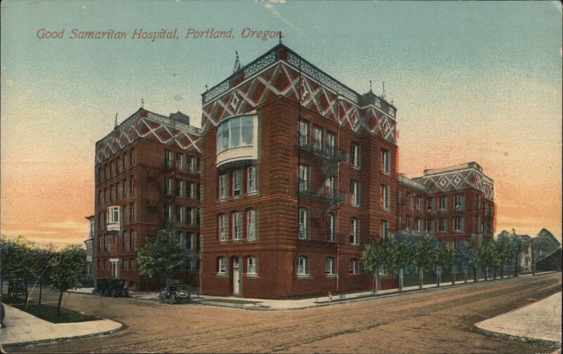 | A view of the Good Samaritan Hospital in Portland, Oregon. The large brick building features decorative geometric patterns in red and white on its facade. Trees line the streets around the hospital, and several vintage automobiles are parked nearby. The back of the postcard has a message written to Miss Hazel Breneman in Rust, California, dated July 13, 1912. The message mentions receiving a card from Will, plans to go to Centralia, and inquiries about Aunt Bessie's lodging. |