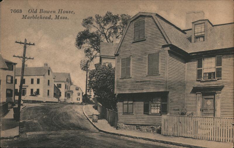| View of the Old Borwen House, a gambrel-roofed wooden building with shutters on the windows, located on a street corner in Marblehead, Massachusetts. A white picket fence surrounds the house. Another house is visible further down the street, and a telephone pole stands nearby. Back of card has divided back. |