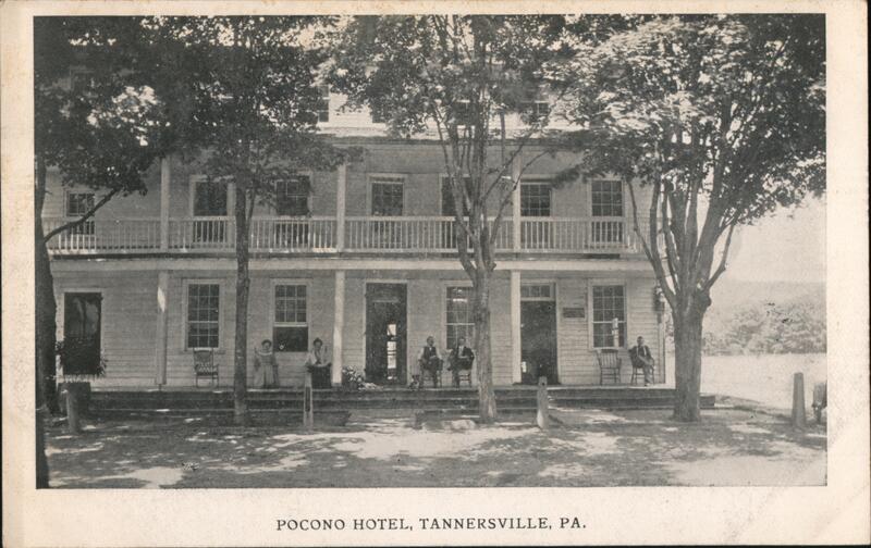 A view of the Pocono Hotel in Tannersville, Pennsylvania. Several people are seated on the porch of the hotel.