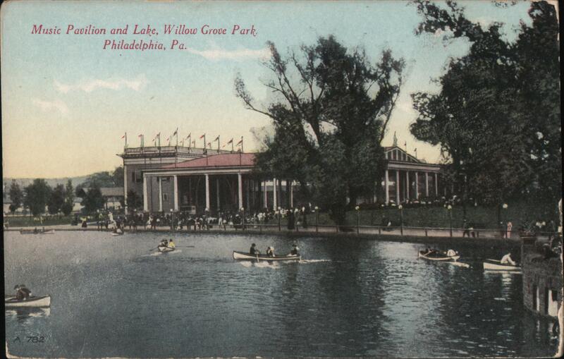 Front: Music Pavilion and Lake, Willow Grove Park Philadelphia, Pa. 782 1111 Back: Music Pavilion and Lake, Willow Grove Park, seating 30,000 people at afternoon and evening concerts, given by an excellent band. Two cents