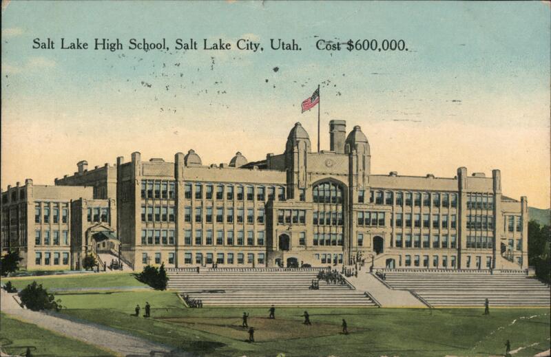 A colorized image of Salt Lake High School. There are figures on the steps and in the lawn. "Cost $600,000" is printed in the top right corner. The back is addressed to Marlon Sheels in Nevada, Missouri and has a 1 cent stamp. The message reads, "Am having an awful time. Am so tired. To come home Monday morning early. Will be in Nevada about three days. Am going to Frisco and some other places. Hope you are all well. Write soon. Lovingly, Carll." |